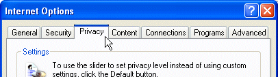 - The Internet Options Dialog will display, then click on the Privacy Tab